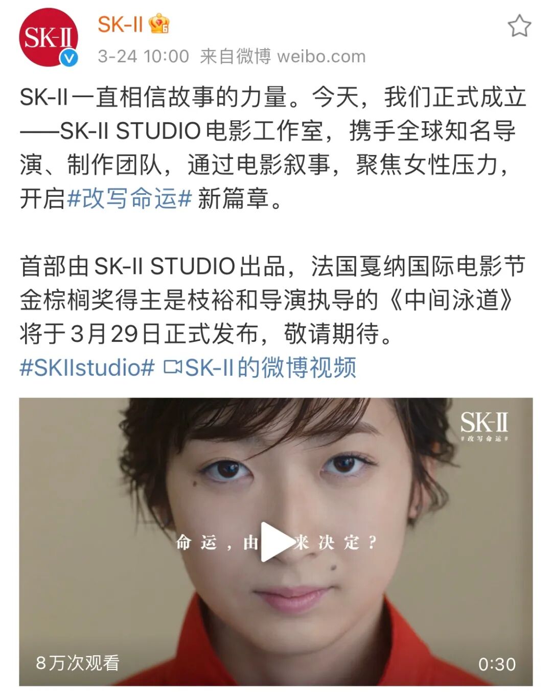 3 月 29 日,SK-II STUDIO 的首部影片《中间泳道》正式公映,由日本著名导演是枝裕和执导。SK-II STUDIO 是 SK-II 于 3 月 24 日宣布成立的首个品牌电影工作室,将通过影像的力量,探讨现代女性所面对的种种压力和社会议题。此次 SK-II STUDIO 的设立也是构成品牌理念「#CHANGEDESTINY改变命运」的重要一环。伴随 SK-II STUDIO 的设立,SK-II 也准备了#CHANGEDESTINY 资金,2021 年将以 50 万美元为上限,1 次影片播放量将计入 1 美元,用于支援为了改变命运而付诸行动的女性。