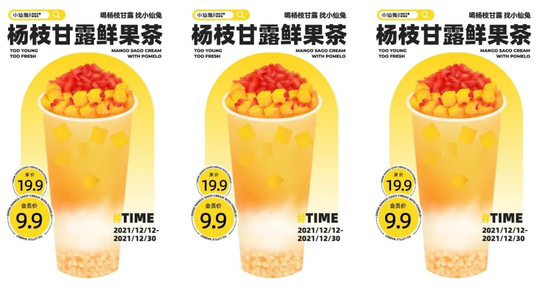 「小仙兔」在2020年开始打磨第一家门店,主打会员价9.9元的平价鲜果茶,以杨枝甘露鲜果茶为代表产品,切入点是选择偏好程度较高的鲜果茶,以平价售卖同高端品牌同品质的鲜果茶。