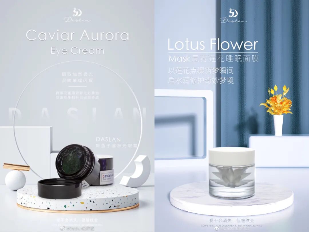 「Daslan」隶属沈阳黛斯蓝伊莎生物科技有限公司,从2014年开始专注于抗衰老功效化妆品产品的研发,于2020年正式投产并推向市场,面向25-35岁用户群体。目前,其已推出四款产品:黛斯蓝鲟鱼子酱面霜、黛斯蓝鲟鱼子酱极光眼霜、黛斯蓝鱼子极光精华水、黛斯蓝晨雾莲花睡眠面膜。