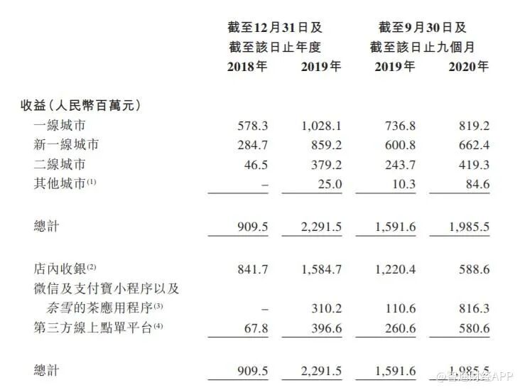 招股书中还指出,2017年底,奈雪的茶茶饮店数量为44间,至2021年2月5日,已增至507间。其中,一线城市和新一线城市是公司的主力市场,截至2018年度、2019年度及2020年9月30日止九个月,一线城市收入占总收入的63.6%、44.9%及41.3%;新一线城市收入占总收入的31.3%、37.5%及33.4%。