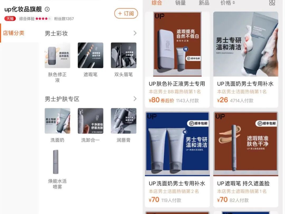 据「UP」天猫官方旗舰店目前显示,共有男士彩妆于男士护肤两大分类,9款sku,单价百元左右。