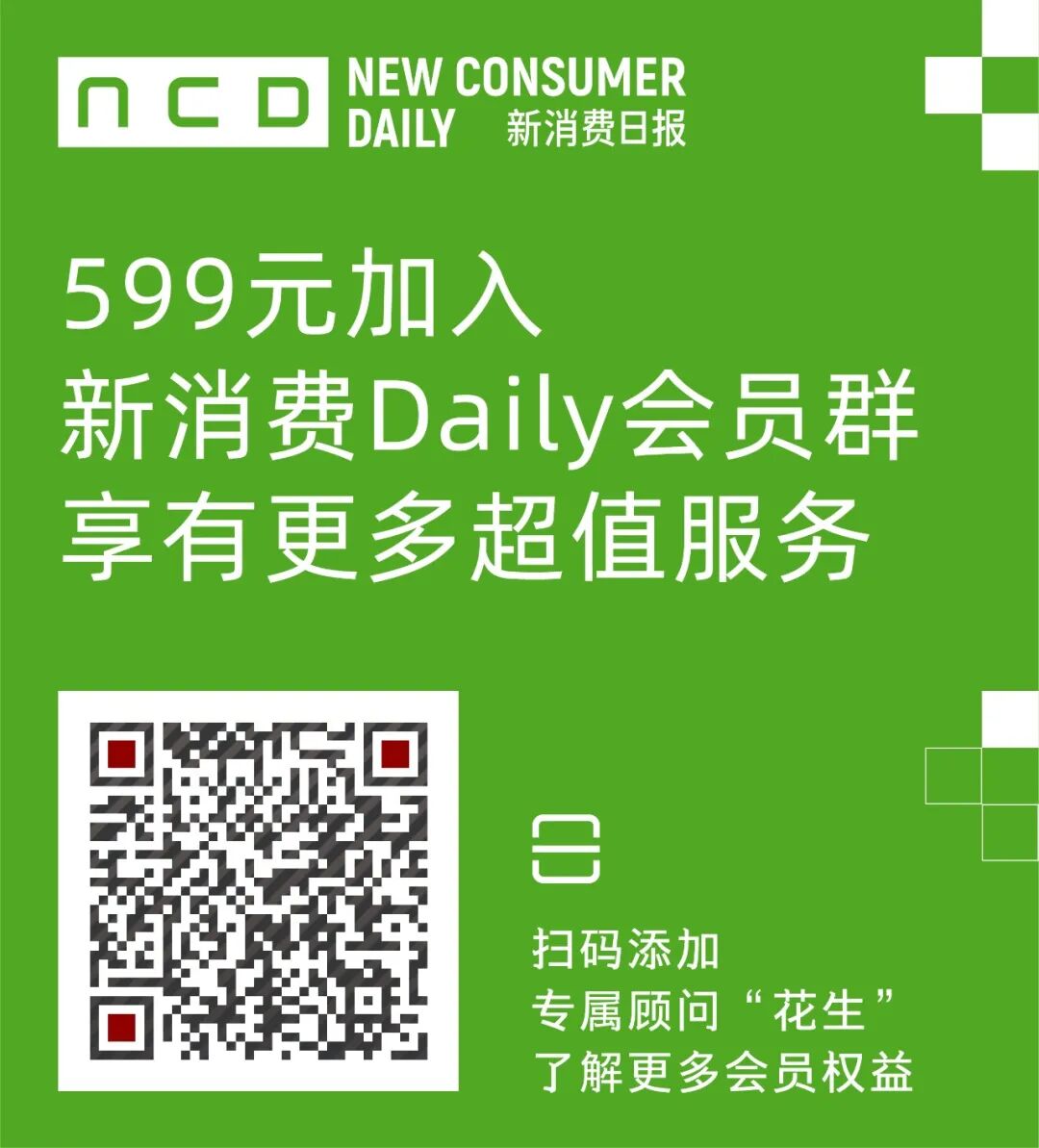 灵眸大赏、品牌峰会、跨境峰会等多场活动,所有会员享有免费门票、活动嘉宾授权的PPT资料及速记文章等;深度合作者可在活动期间品牌露出、或作为嘉宾上台分享等。根据会员需求,全年会不定期召开IP联名、跨界合作、招商等资源对接活动,为品牌与品牌、品牌与渠道、品牌与服务、品牌与资本等各方间架起桥梁,加速更多项目落地。在新消费品牌高速发展阶段,“人才”一定是最紧缺的资源,新消费Daily将以周、半月等为周期,为会员发布招聘信息,在更精准的平台上找到更精准的人才。目前新消费Daily吸引了丰富的投资人资源和品牌资源,欲搭建起资本与优质项目间的对接平台,让好的项目找到靠谱的资本助力,让好的资本及时发现优秀的项目。及时推送行业早报、热点资讯,更深刻的行业数据洞察、趋势报告等;会员之间也能就热点话题、困惑进行观点碰撞;以及资源合作等。注:以上权益,会员均享有免费or优先参与or价格优势等专享服务。新消费从业者及相关产业从业者(品牌、资本、第三方)均可入会流程:提交资料-介绍服务、审核-缴纳费用-入群感兴趣的同学,可以扫码添加小新同学的微信二维码,申请入群。
