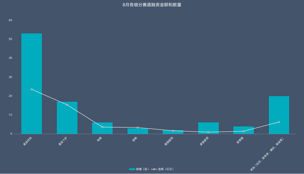 具体来看,在8月的投融资数据中,无论是数量还是金额,食品饮料、美妆个护两大赛道依旧遥遥领先。