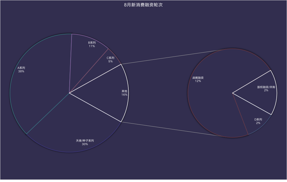 另外从融资轮次上来看,资本仍以早期项目为主,A系列及天使轮占比达到68%,但与7月的71%相比,比重有所减少;且B轮及B轮之后的融资数量明显增多,占比达到32%。如B轮7月10%、8月11%;C/D/E/F系列7月4%、8月7%。