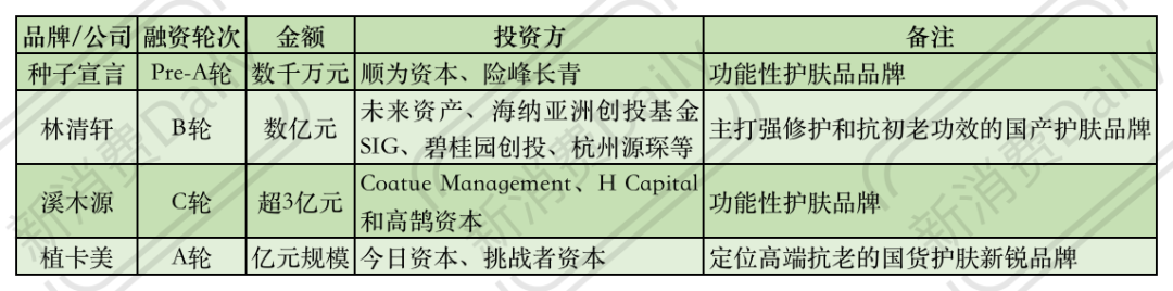 在8月份的美妆融资中,除上文提到的智能科技感更强外,功效型护肤趋势更加强烈。虽然这一类目下,只有四个品牌融资,但三个品牌都拿到了上亿融资,尤其植卡美是被披露的第一次融资,就已是亿元规模。