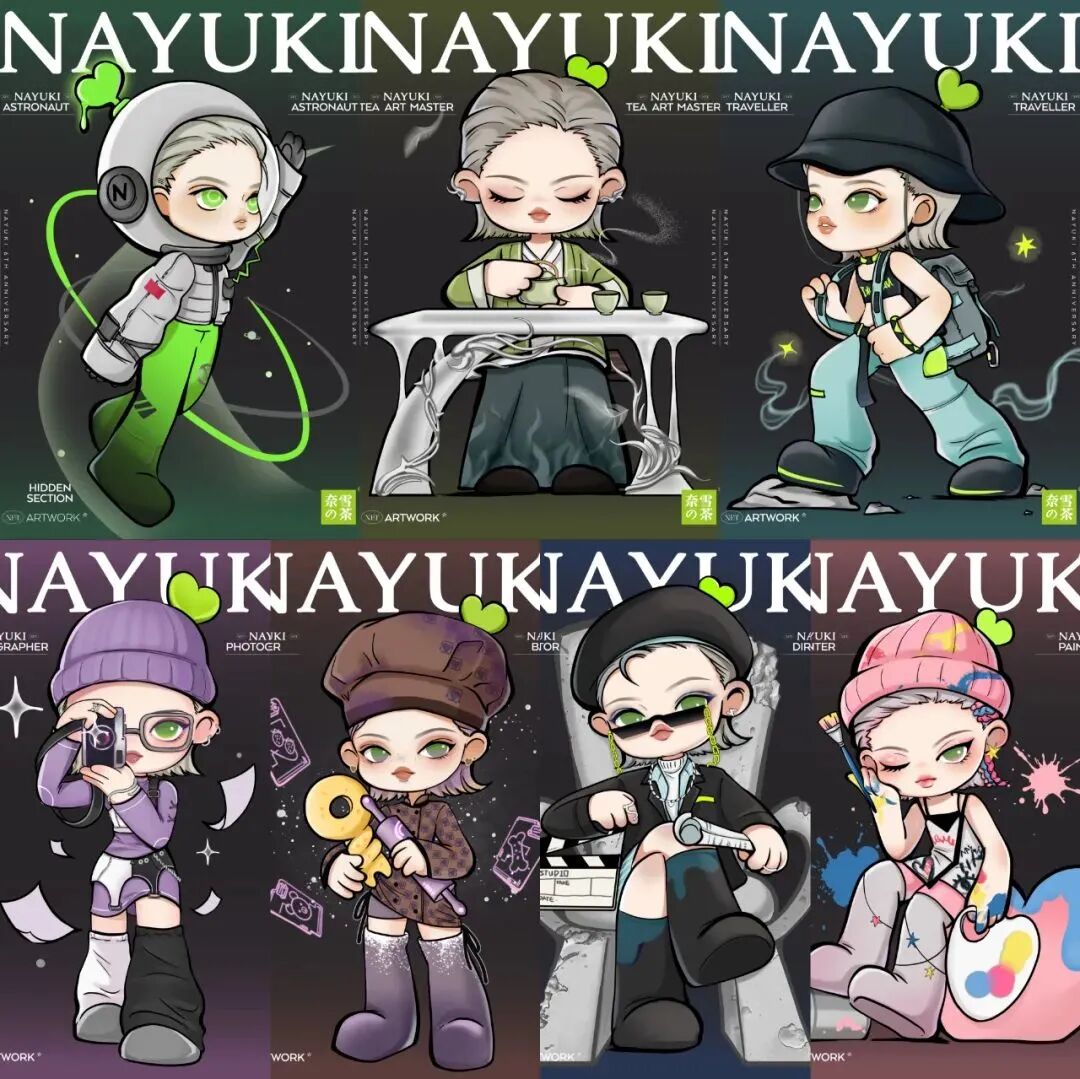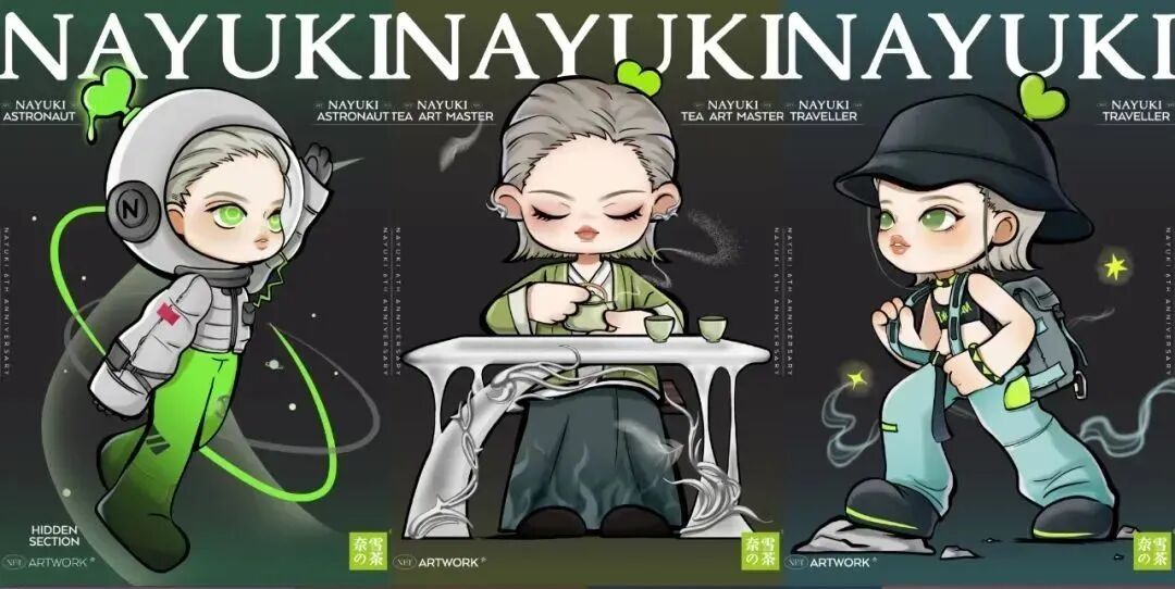 第三,也是最引人关注,最具创新性的尝试,围绕「NAYUKI」这一IP,奈雪推出线上NFT数字艺术品 ,含隐藏款在内共7款,全球限量发行300份,只在线上以盲盒形式发售,不制作实物。