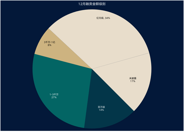 这意味着,在未披露项目中,还有一些融资金额超过亿元的,那么12月的亿元项目超过了30起,占比也超过了34%,而11月的亿元占比仅仅18%,10月也只有23%。