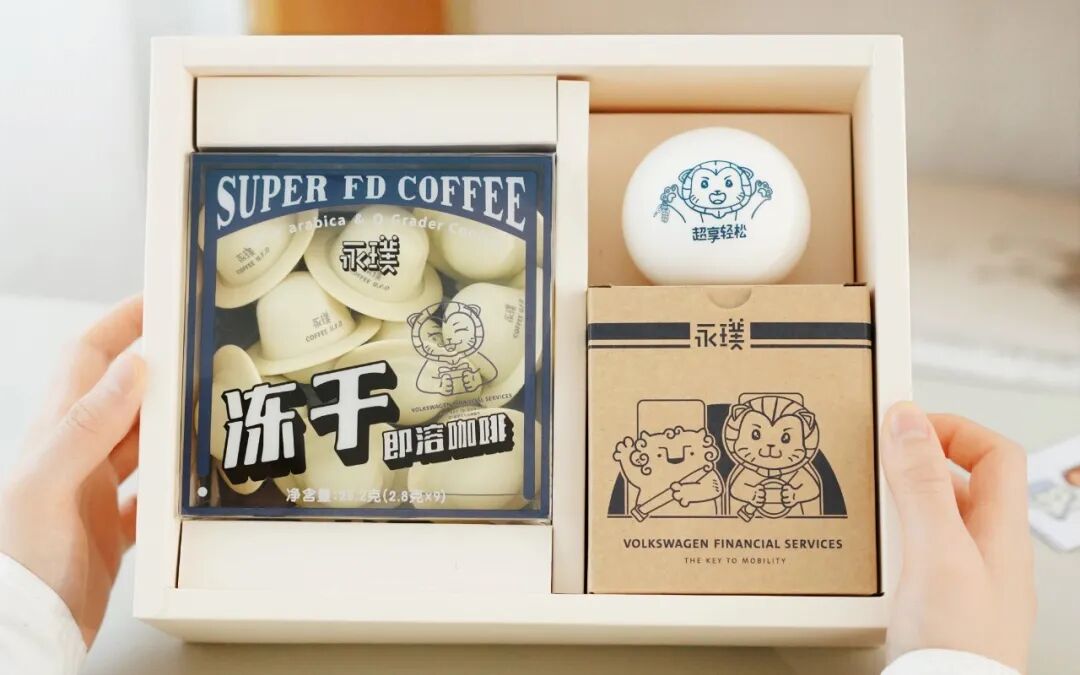 1月14日,永璞咖啡x大众汽车金融中国 跨界合作推出「超享轻松礼盒」,内含限定咖啡、马克杯、解压球和贴纸。