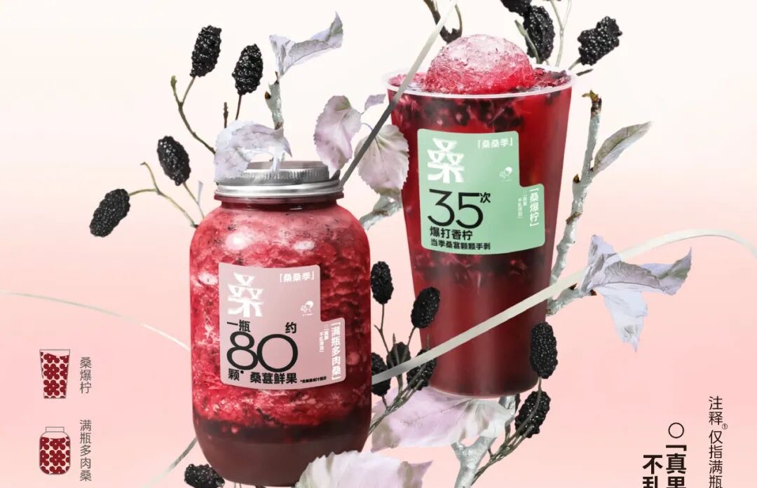 1月21日,喜茶以时令水果当季桑葚为主,推出三款新品:爆打35下的香水柠檬与当季桑葚的「桑爆柠」、一瓶约有80颗,爆炸多肉+绿妍茶底的「满瓶多肉桑」,以及当季桑葚mix经典巨峰葡萄的「满瓶葡萄桑」。