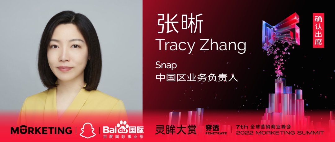 颠木先生,现任莉莉丝游戏广告技术中心负责人,专注于数字营销技术解决方案的探索和实施,致力于营运结合的体系化建设。建立数据闭环,实现高效营销和精准化运营。所带领的团队开发的DAP平台,在行业内成为争相学习的对象。Snap 是一家科技公司,Snapchat 是风靡全球的社交软件,是 AR 广告的开拓者和代入式品牌广告的倡导者,服务了数以千计的中国出海企业走向世界。Snapchat for Business 为各行各业大大小小的企业,提供全渠道社交营销解决方案。我们相信 Snapchat 核心用户代表着新一代的购物者,他们看中购物故事和体验,喜欢尝试新技术,沉浸式地和品牌互动。而 Snapchat 全屏沉浸式体验,极具代入感的数字广告,给了品牌高效触达优质客户的机会,让品牌能够更快打动核心用户、塑造独特品牌形象,以及最终带来高质量的转化。张晰 Tracy Zhang现担任美国Snap公司中国区业务负责人,全面负责 Snap 中国区渠道管理、客户以及合作伙伴的战略制定和落地。此前,Tracy曾供职于谷歌中国,先后负责过为国内外知名的品牌、效果类客户、及媒体代理商提供全面的数字营销解决方案。集度汽车成立于2021年,是一家由百度发起成立,并由吉利战略投资的汽车机器人创业公司。集度致力于全球顶尖的自动驾驶、人机交互科技的工程研发和商业化普及,打造拥有情感和智慧的革命性汽车机器人,还人们更多空间与时间,实现更多可能。作为“汽车机器人”新物种的开创者,集度以高阶自动驾驶能力和高度智能交互能力作为智能汽车的断代标杆,塑造了量产智能汽车产品的全新品类。