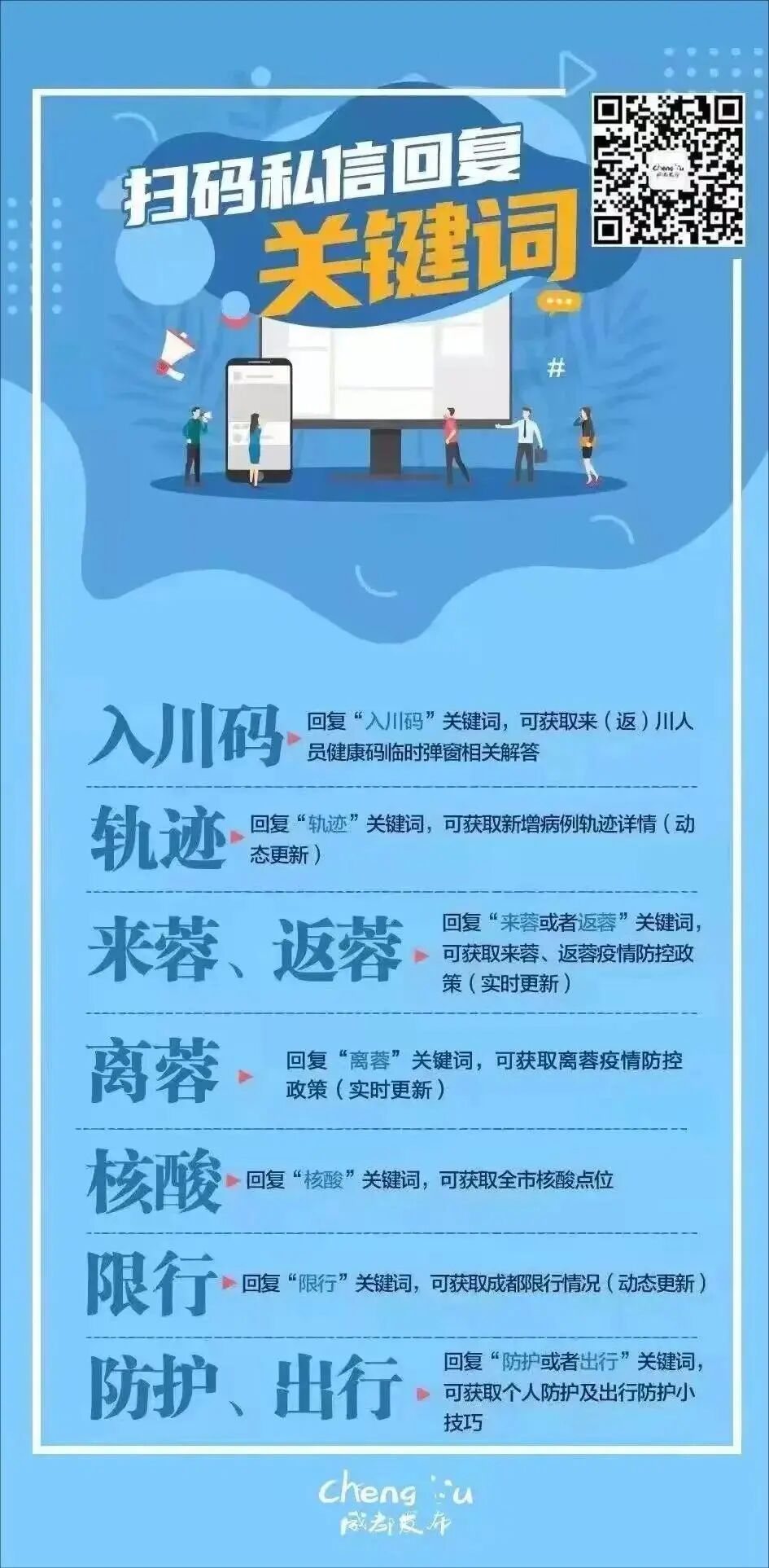 会上,成都市卫健委主任杨小广表示,战疫不容迟缓,当须全力以赴。恳请市民朋友继续做好个人防护。请省外来(返)蓉人员配合疫情防控管理,来(返)蓉必扫“入川码”,主动落实我市防疫政策,规范落实隔离、监测等管理措施,抵蓉三天内完成两次核酸检测,两次结果未出具前不外出、不聚集。建议从省内其他城市来(返)蓉人员坚持做好健康监测,主动在3天内开展两次核酸检测,如有风险城市旅居史的,一定要及时向社区、单位报备。从明日(8月27日)18时起,离蓉须提供48小时内核酸检测阴性证明。