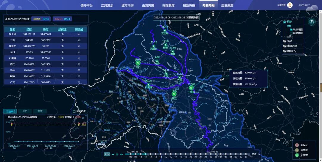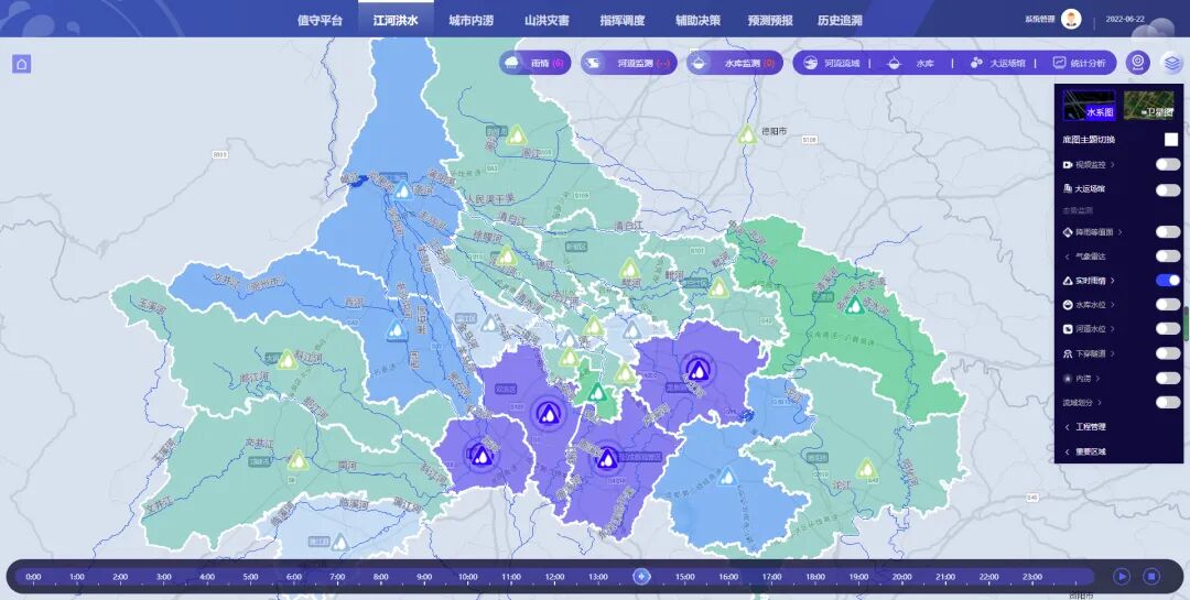 针对洪涝灾害的主要类型,该系统构建了江河洪水一张图、城市内涝一张图、山洪灾害一张图三个专题,叠加了流域划分、闸坝、下穿隧道、重点内涝点位、视频监控、降雨等值面、气象雷达、实时雨情、水库水情、河道水情等10余个专题图层。系统已将所有工程信息、责任人信息数字化,为指挥调度提供数据支撑。同时系统可根据站点位置自动关联周边视频,第一时间掌握现场情况。“为实现灾害预测预报,我们已初步建成沱江水文模型、南河水文模型、1×1公里网格化降雨预报模型、中心城区内涝模型,并投入试运行。”该负责人表示,目前该系统还处于学习阶段,例如中心城区内涝模型。