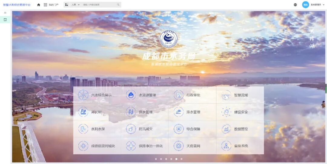 在成都市蜀锦路成都市水务局防汛抗旱指挥部的办公室,进门左转就能看到一块布满整面墙的大屏幕。通过这块大屏幕,不用走出办公室,就能知道成都全市与水相关的各类信息,包括实时雨情、江河洪水、城市内涝点位、山洪灾害、河道水库水情等。这张屏幕的背后是“智慧蓉城”八大场景之一的智慧水务。成都市水务局工作人员点亮屏幕,可以看到智慧水务综合管理平台包括水资源管理、河长制、供水管理、排水管理、防汛减灾、天府蓝网等12个功能模块。