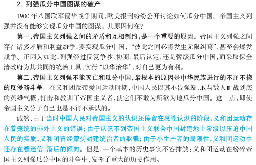 1.帝国主义列强并没有能够实现瓜分中国的根本原因:中华民族进行不屈不挠的反侵略斗争。