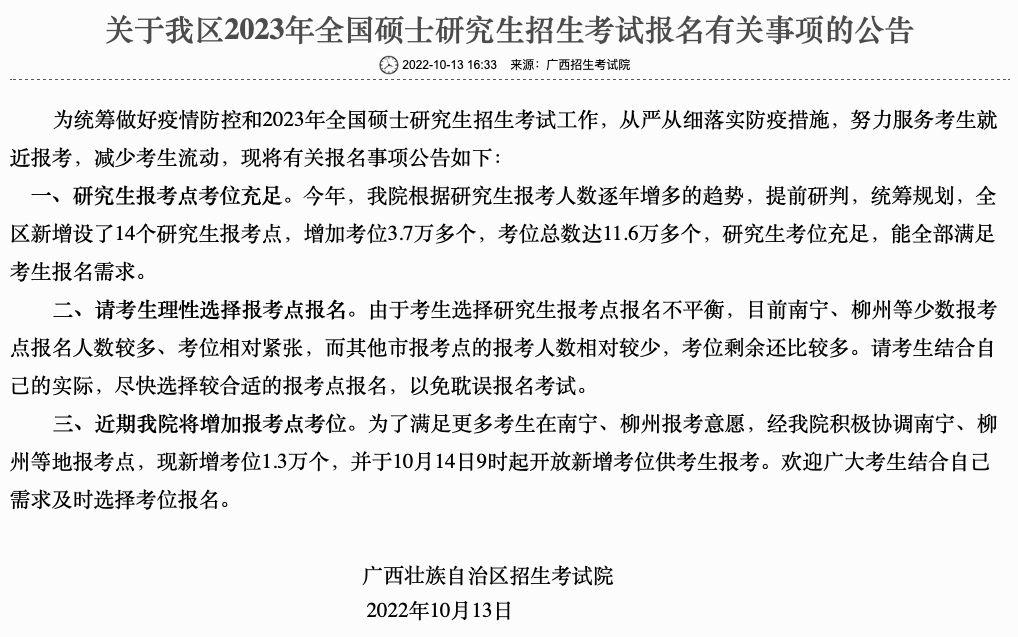 广西招生考试院发布公告:为了满足更多考生在南宁、柳州报考意愿,现新增考位1.3万个,并于10月14日9时起开放新增考位供考生报考。