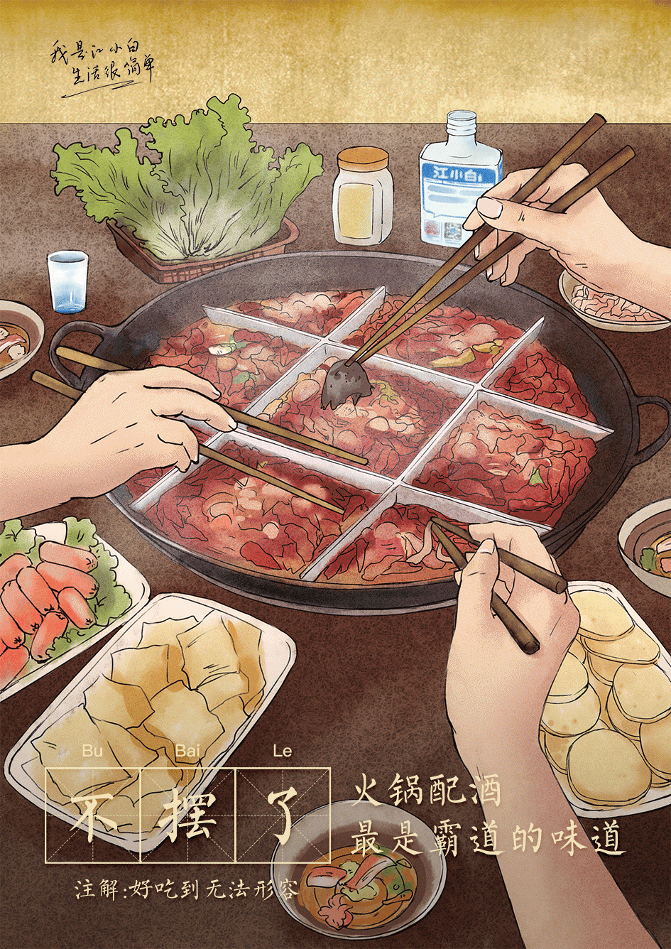 评语:江小白出生在重庆,今年正逢重庆成为直辖市20周年,江小白用一组体现重庆味道的GIF图,来传递重庆的日常、重庆的“巴适”。其实我一直不喜欢江小白,我身边包括我几乎没有人对江小白进行二次购买。他们一直耕耘于产品包装,而忽视产品本身。作为一个品牌长期发展来说是不明智的。但这一组海报以重庆民色特色为出发点,值得点赞。