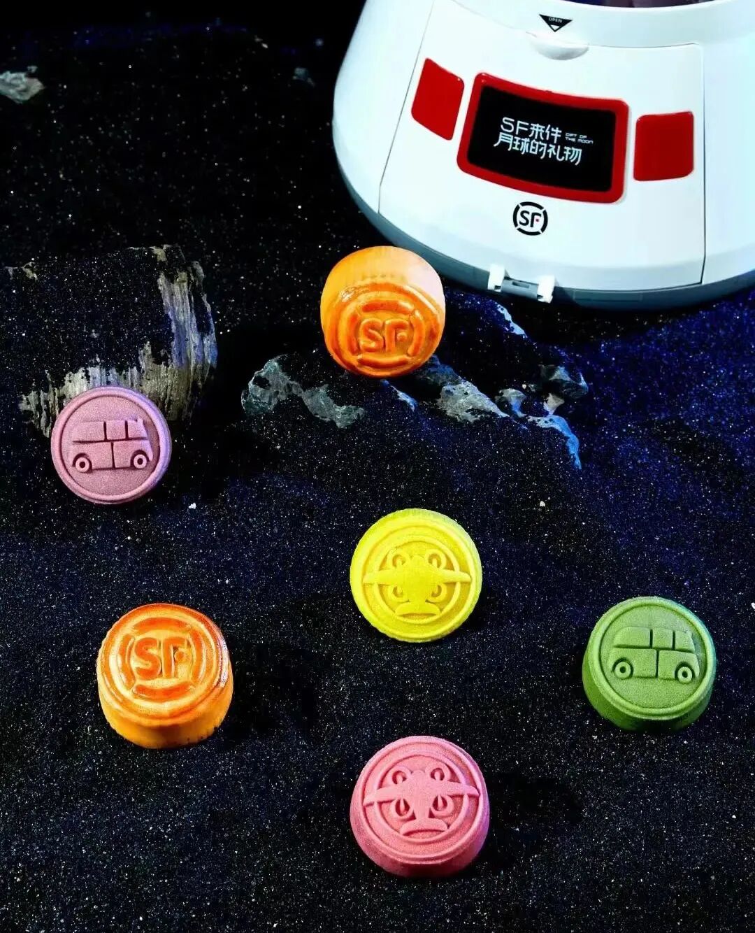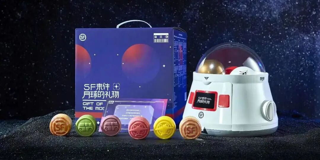 顺丰的月饼包装盒,特意做成了月球返回舱的形状,实际是一个月饼扭蛋机。随着旋钮转动,就可以获得定制的月饼以及DIY生态盆栽。