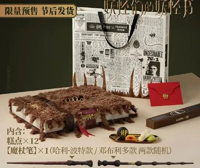 好利来推出的霍格沃茨中秋主题礼盒,带有满满的魔幻中秋元素。礼盒外形酷似一个带有四只炯炯有神的眼睛、张着嘴巴、浑身毛茸茸的妖怪魔法书。打开之后,可以看到礼盒上方带有密密麻麻的魔法文字,里面装有一封信和一支魔杖,那是来自魔法世界的问候。掀开两侧的盖子之后则是不同造型的糕点,礼盒中还带有一份极具魔法气息的“食用说明”。福 利