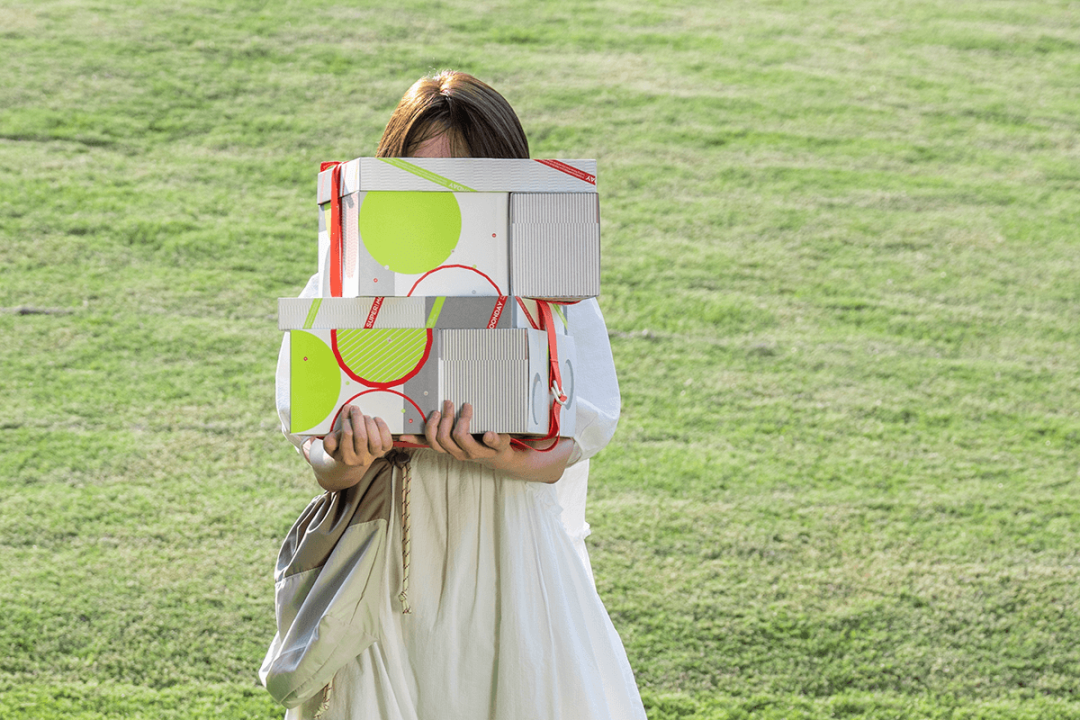 包装简洁,采用渐变色的手提袋和以云南梯田为灵感源泉的包装盒,盒子能重复利用,十分环保。