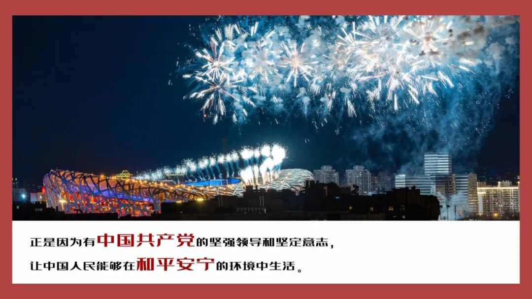 我感到安宁的幸福。中国共产党领导和组织的抗日战争,是救国之战,这场战争之后,中国人民有了国的认同感。中国共产党领导和组织的一场伟大的解放战争,是立国之战,这场战争之后,中国人民有了家的归宿感;中国共产党组织和领导的一场伟大的抗美援朝战争,是守国之战,这场战争其实是正义之战,这场战争之后,让世界列强看到了中国人民的血性和刚性,从此,中国人民有了家的安全感。纵观世界风云,人民群众生活在今天的中国,正是因为有中国共产党的坚强领导和坚定意志,让中国人民能够在和平安宁的环境中生活。