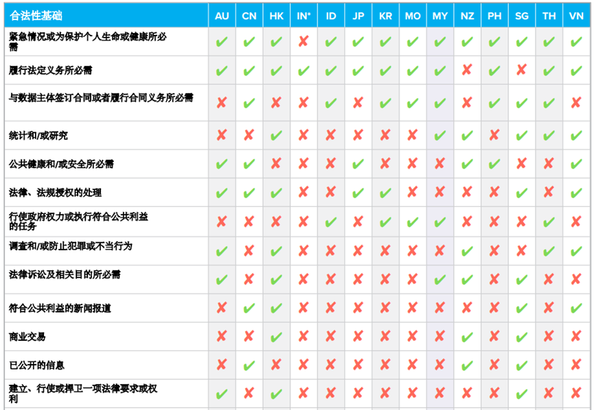 表2 亚太地区14个司法管辖区的数据保护法律中除同意以外其他处理个人数据合法性基础的概述