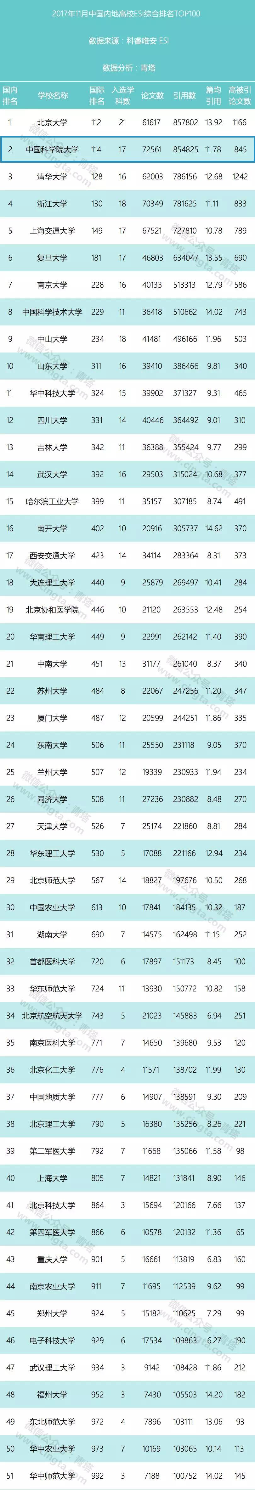 本期青塔统计了科睿唯安公布的2017年11月ESI中国内地高校TOP100的数据。