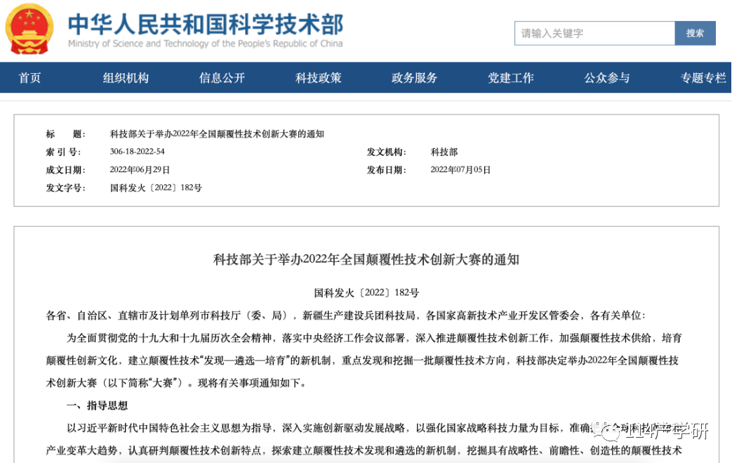 7月5日,科技部官网发布《关于举办2022年全国颠覆性技术创新大赛的通知》,为深入推进颠覆性技术创新工作,加强颠覆性技术供给,培育颠覆性创新文化,建立颠覆性技术“发现—遴选—培育”的新机制,重点发现和挖掘一批颠覆性技术方向,决定举办2022年全国颠覆性技术创新大赛。