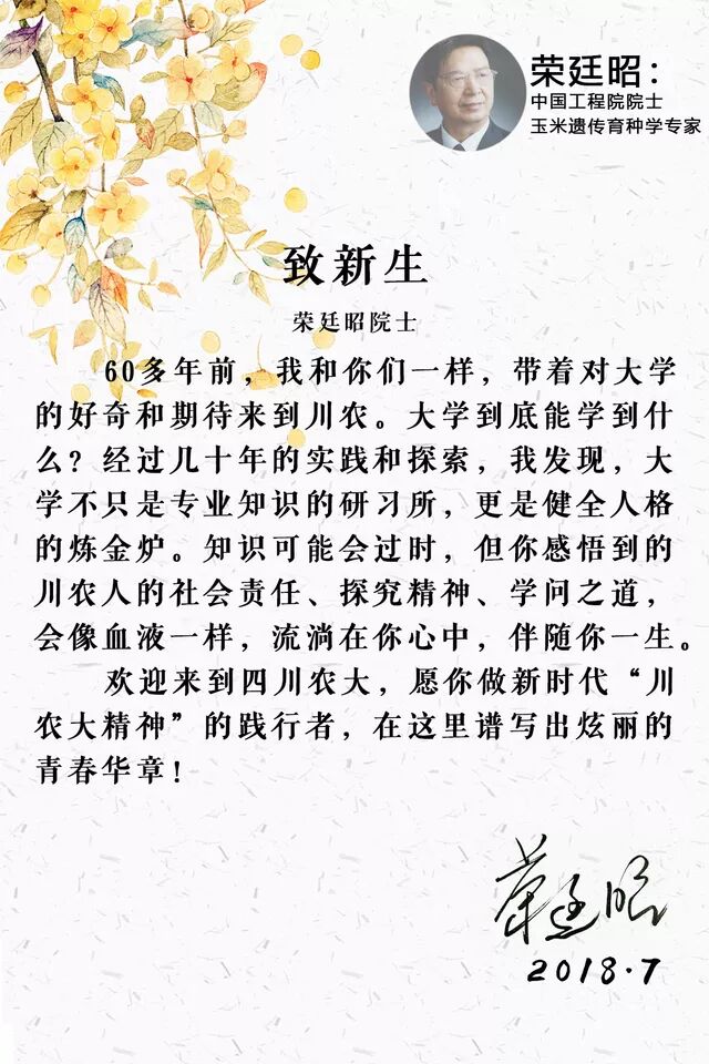 一封致新生的信,蕴含着荣廷昭院士对新生们的殷切期盼——愿你在川农大写出青春华章,做新时代“川农大精神”的践行者。