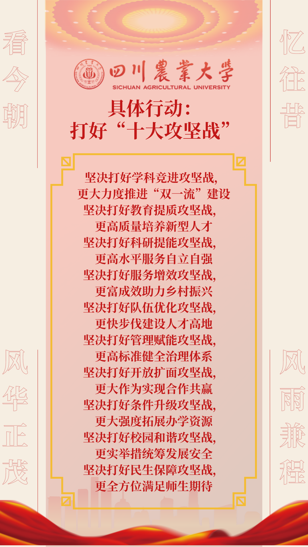一定要弘扬“川农大精神”,以奋斗奋发之态展现干事创业新作为。当前,学校高质量发展正处于爬坡上坎、滚石上山的紧要之处,只要每位川农人都发扬“川农大精神”,领导干部冲锋在前、身先士卒,摒弃平庸、拒绝佛系,当好火车头,教师用心育人、潜心科研,摒弃内耗、拒绝内卷,当好经师人师,教职工爱岗敬业、忠于职守,摒弃懈怠、拒绝躺平,当好螺丝钉,川农大的明天一定更美好。