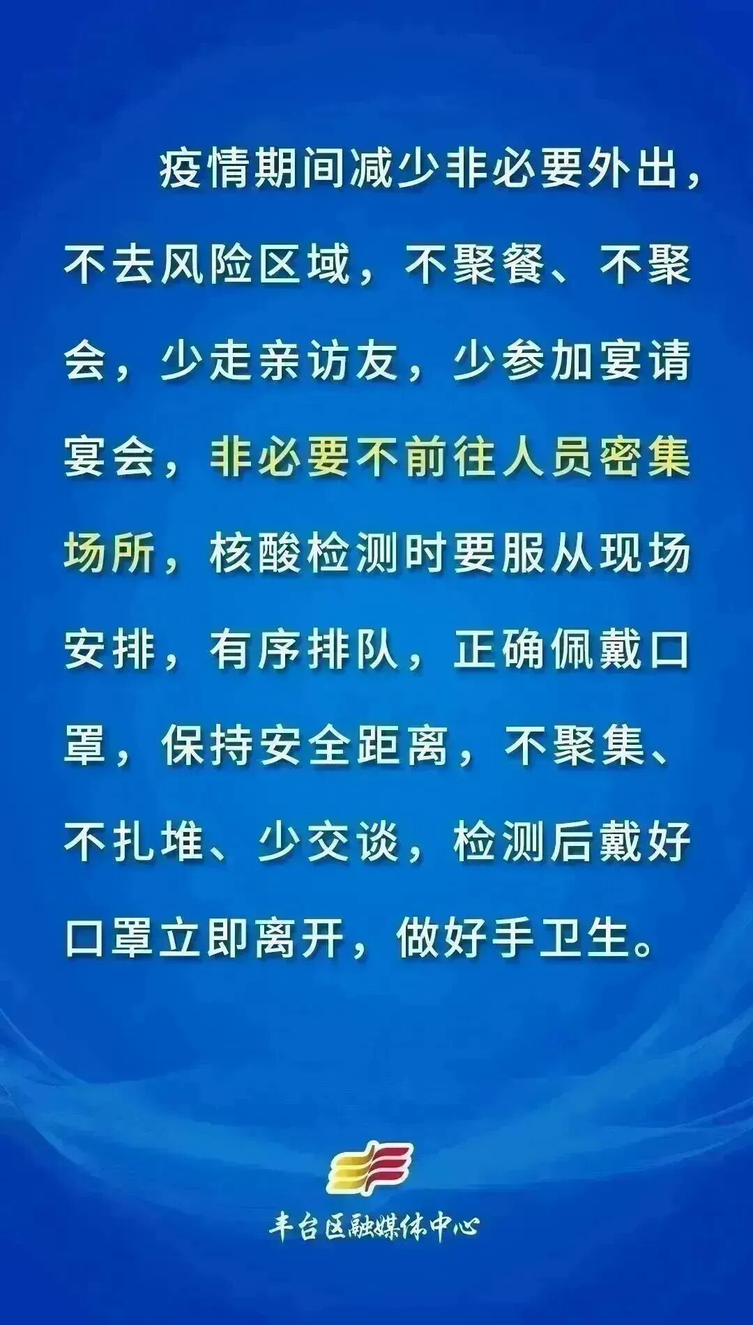 属地、行业、单位要切实履行主体责任,狠抓防疫措施落实,严格规范管理,做好服务保障,加强督导检查,紧盯重点场所、重点单位、重点人群防疫管理,减少聚集性活动,做好人员健康监测,加强健康知识宣传,做好清洁消毒。