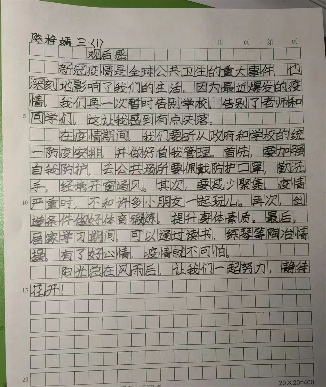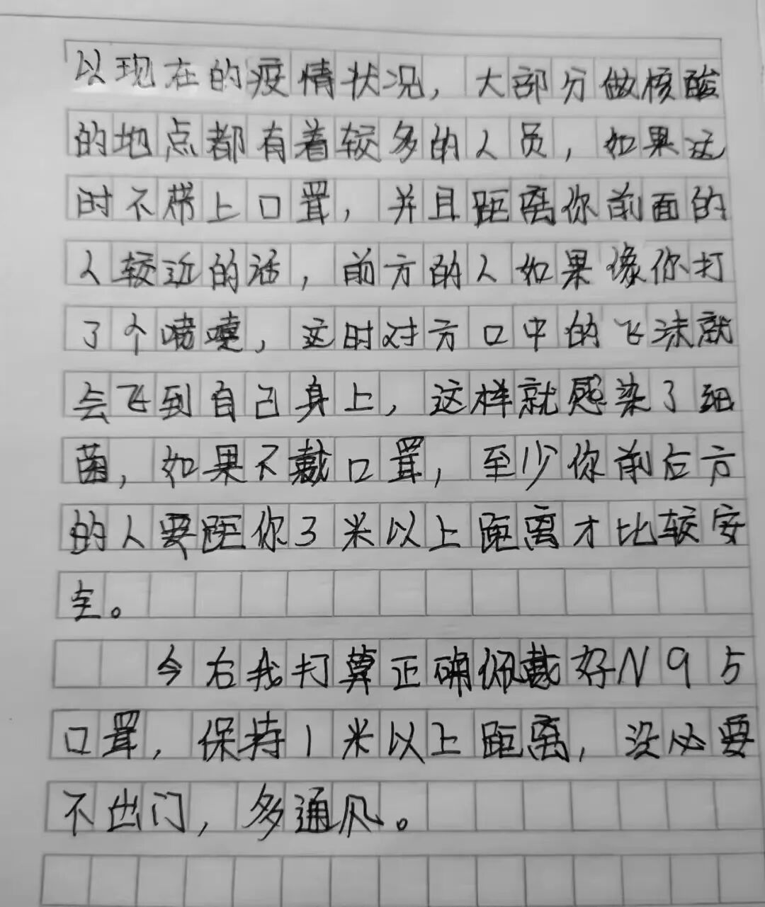 面对来势汹汹的疫情,居家学习的我们,更应该积极响应配合国家的防疫政策。身为学生,首先在居家学习的时期,我应更加倍勤奋,不松懈,不懈怠;我还应该在日常生活中学会转移注意力和自我暗示,与情绪和解,不恐慌,不陷入负面情绪。
