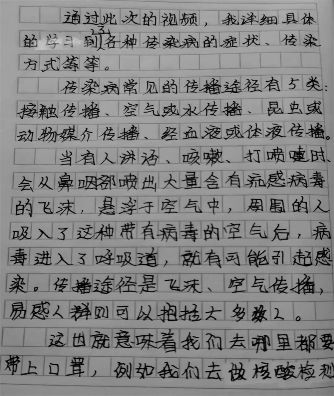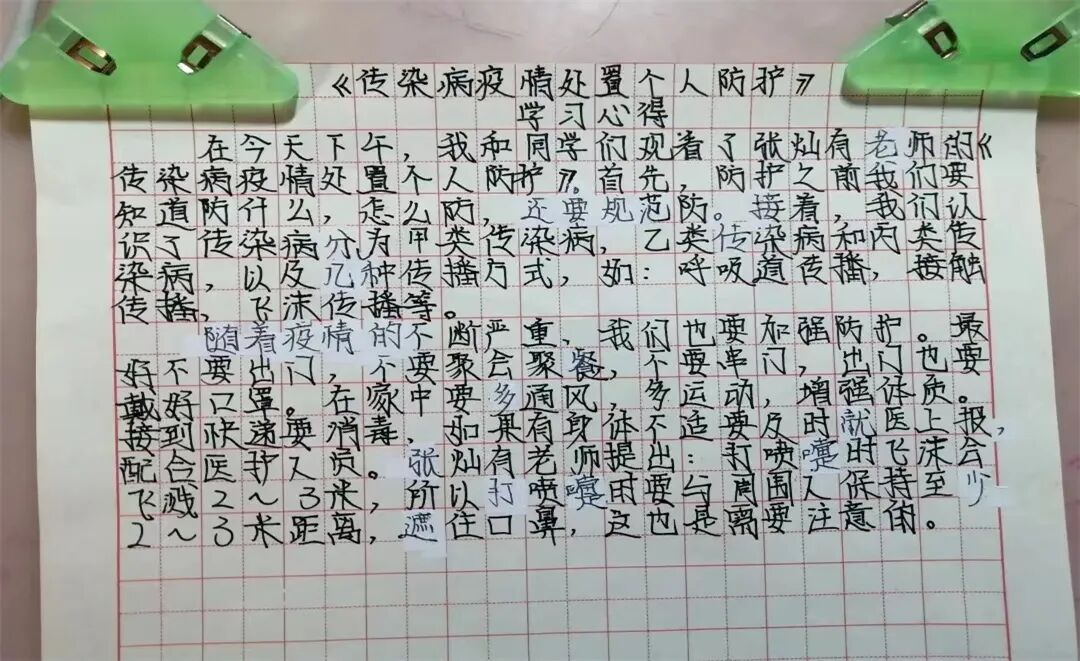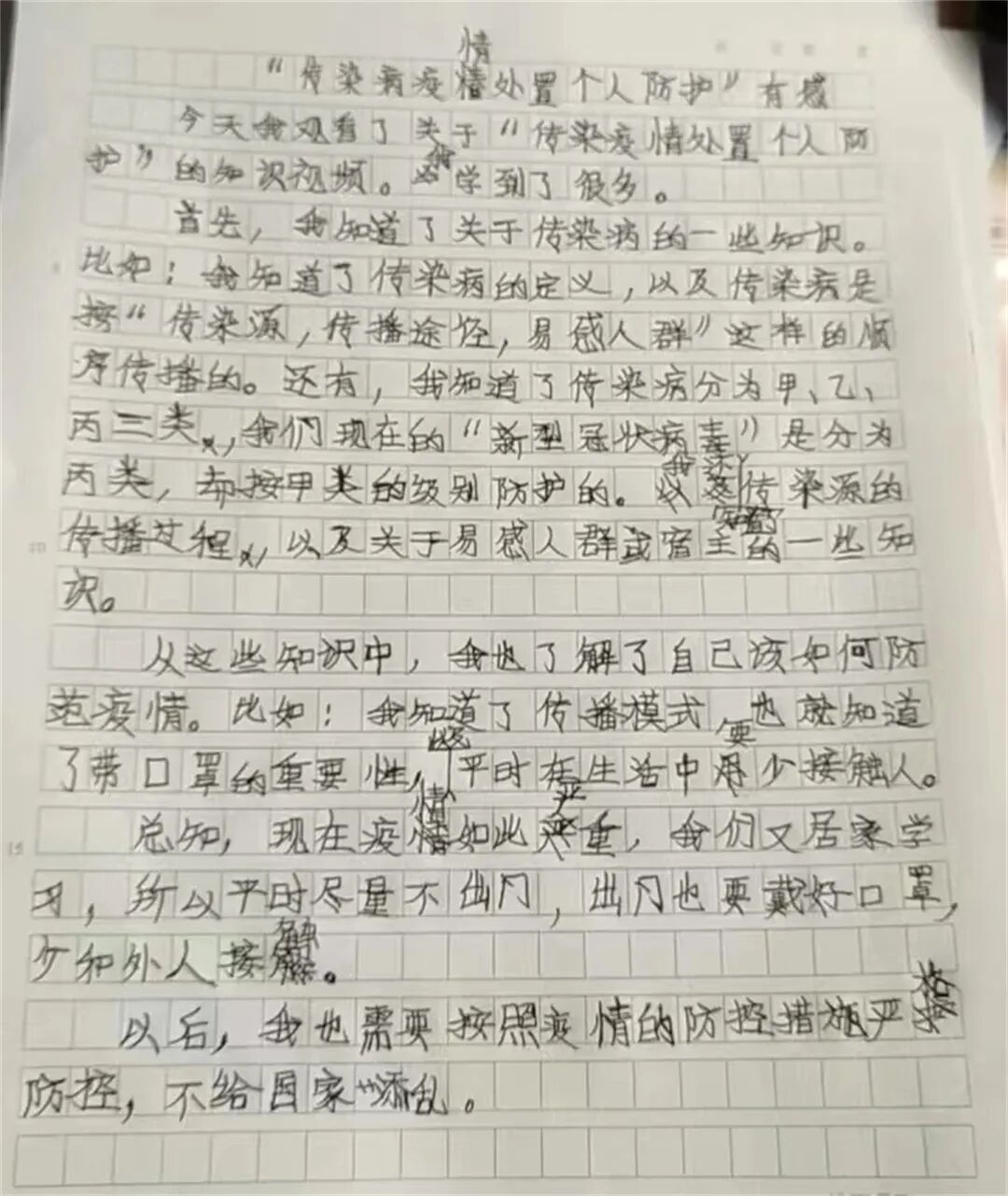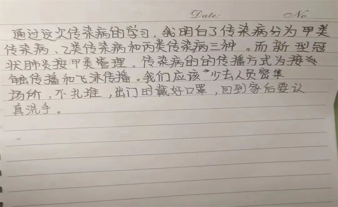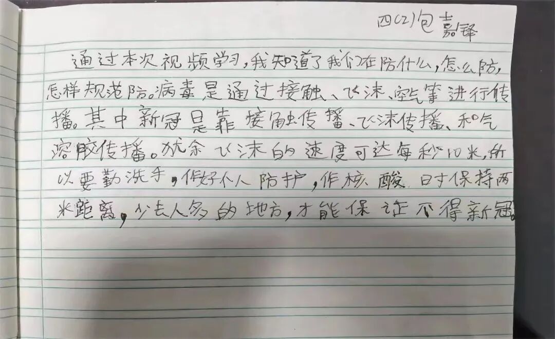今天我和爸爸一起观看了传染病疫情处置个人防护的视频课,进一步了解了新冠病毒的传染源,传播途径和传播模式,掌握了科学的预防方法,让我印象深刻。我要按照视频里教的,做好个人防护,好好洗手,出门戴好口罩。