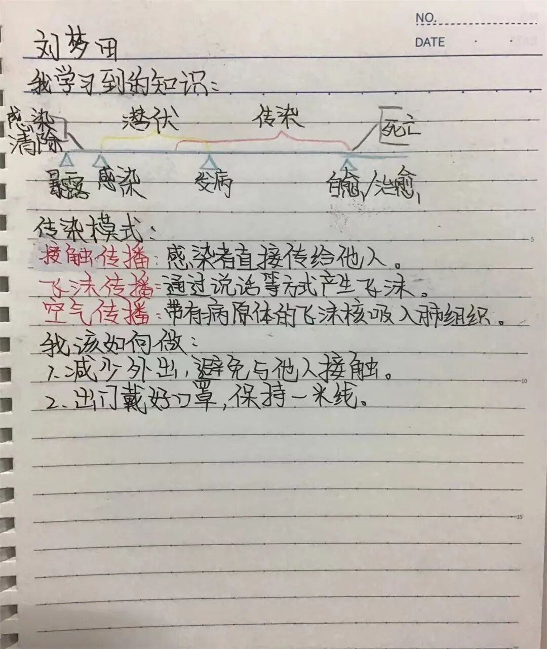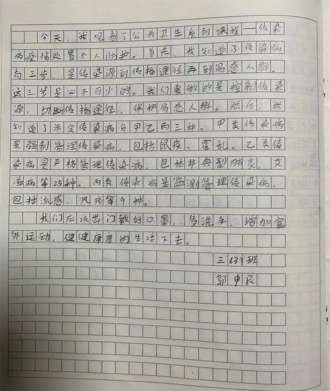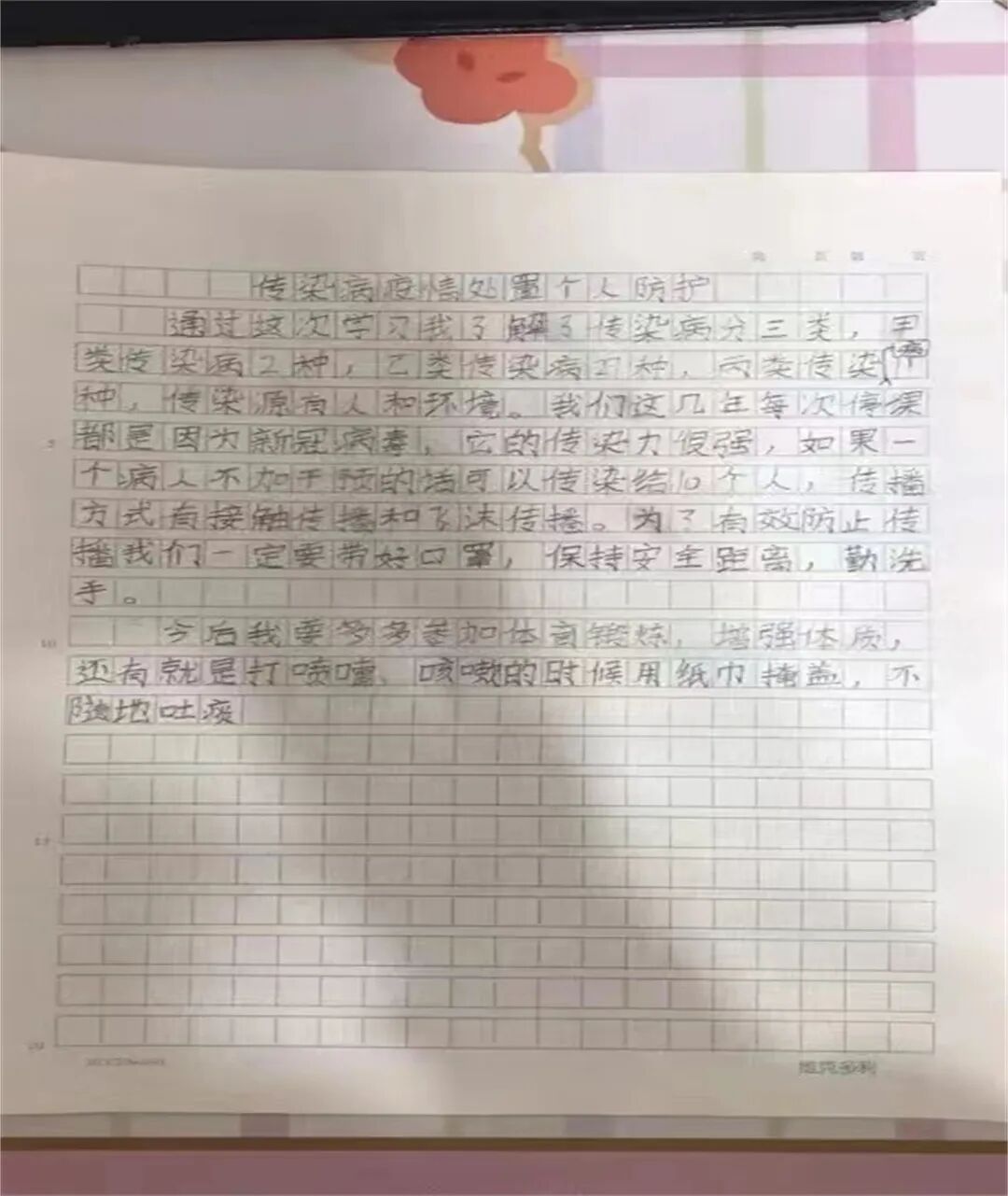 今天我和爸爸一起观看了传染病疫情处置个人防护的视频课,进一步了解了新冠病毒的传染源,传播途径和传播模式,掌握了科学的预防方法,让我印象深刻。我要按照视频里教的,做好个人防护,好好洗手,出门戴好口罩。