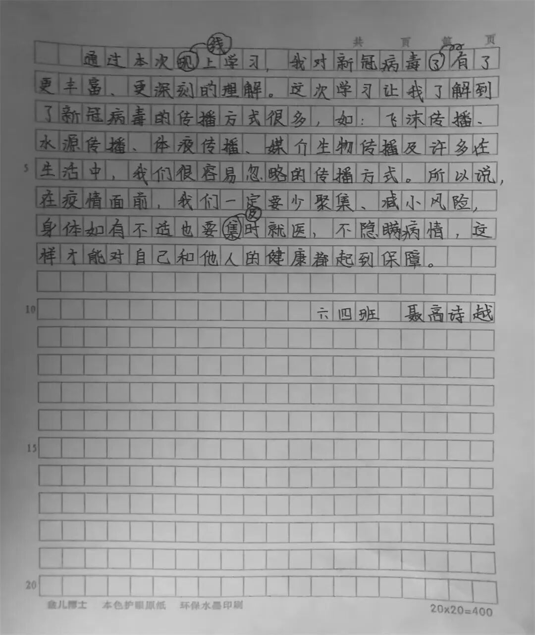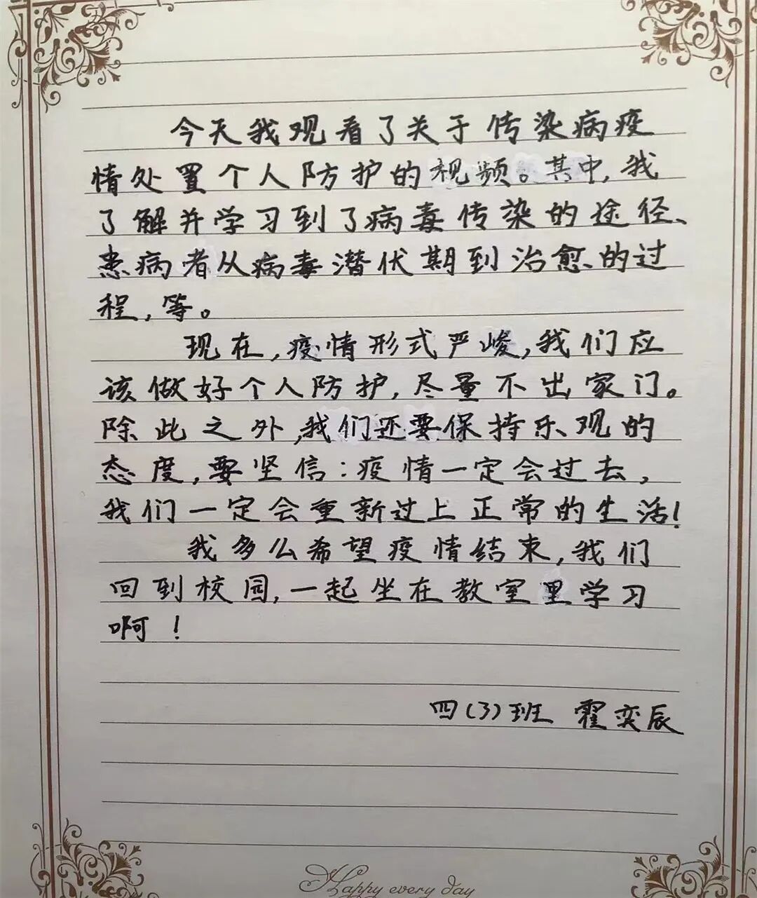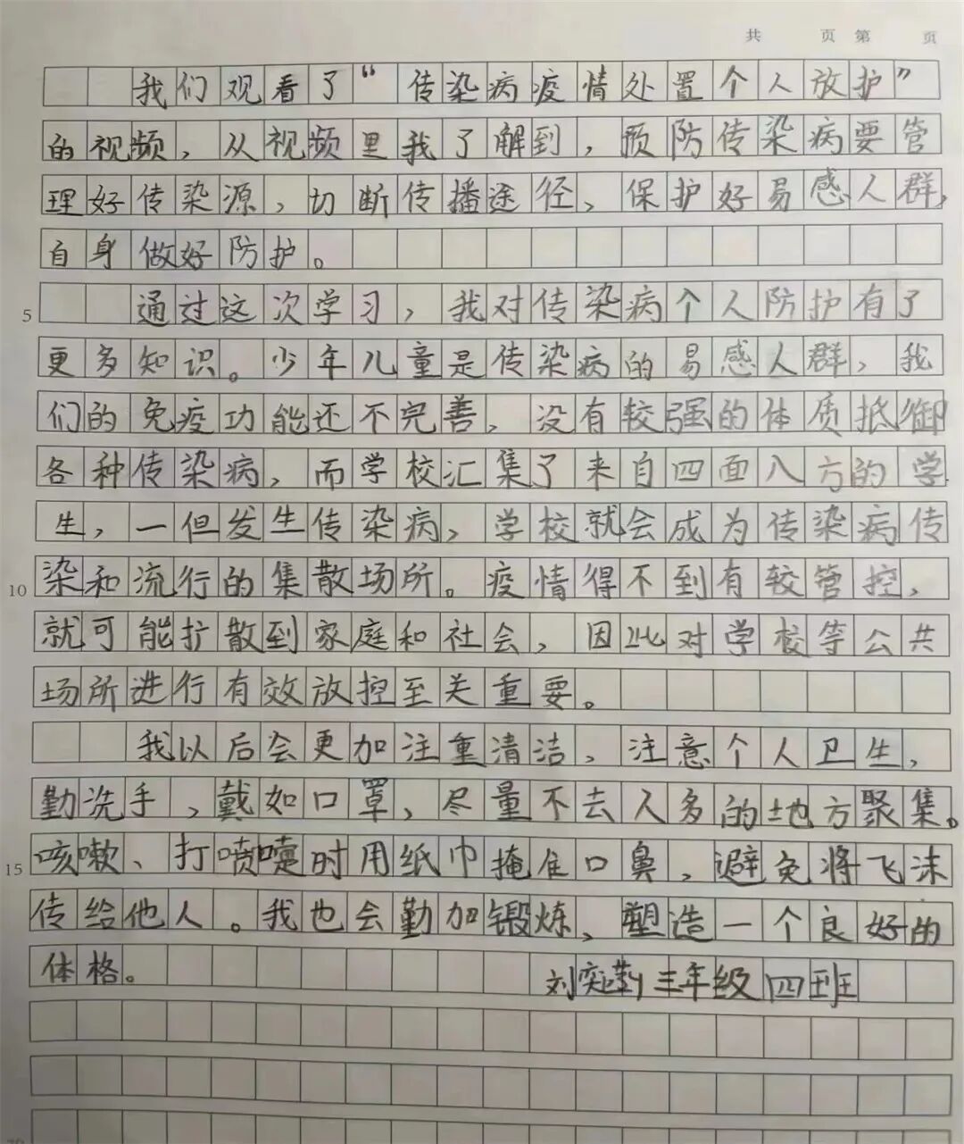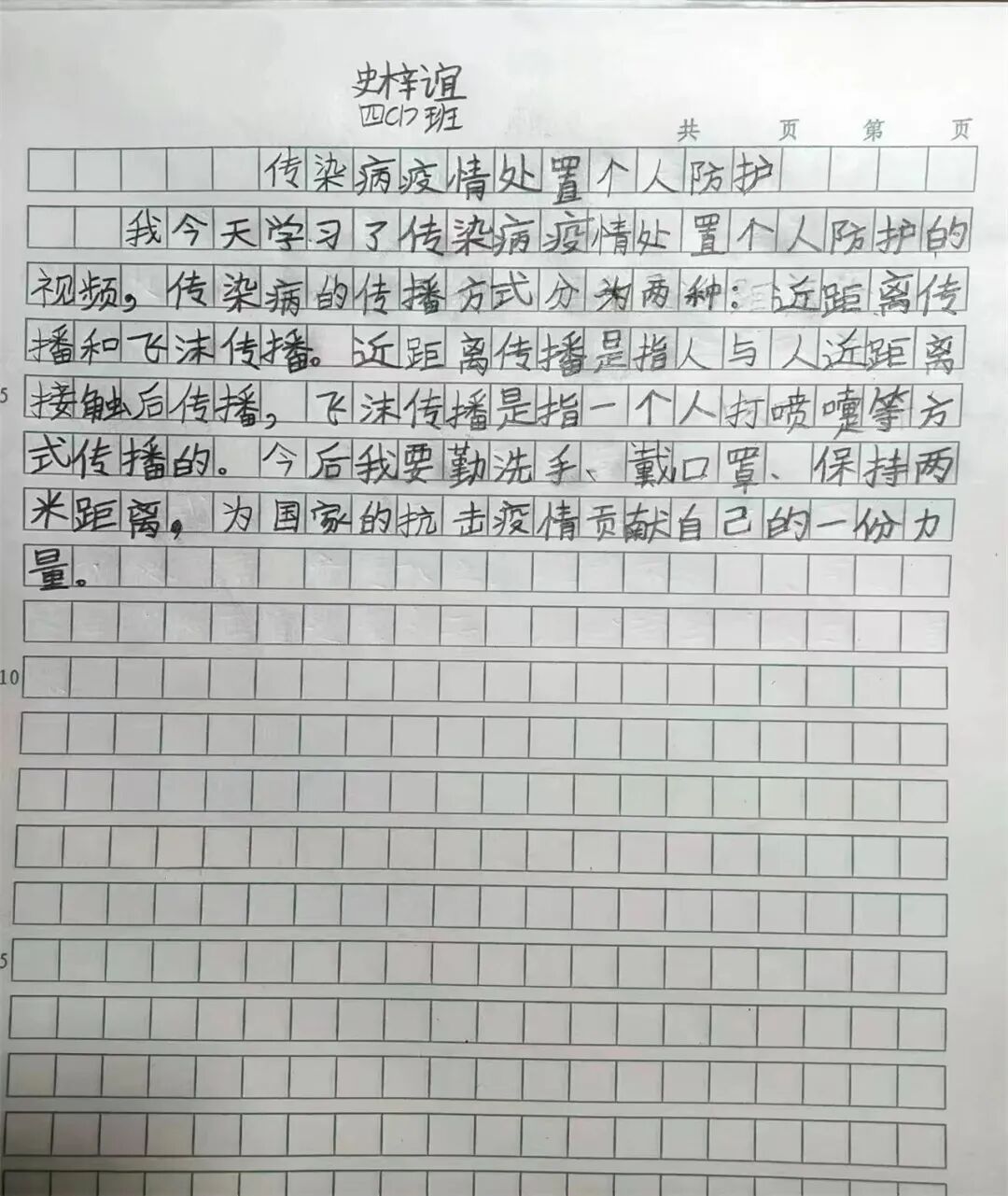今天我和爸爸一起观看了传染病疫情处置个人防护的视频课,进一步了解了新冠病毒的传染源,传播途径和传播模式,掌握了科学的预防方法,让我印象深刻。我要按照视频里教的,做好个人防护,好好洗手,出门戴好口罩。