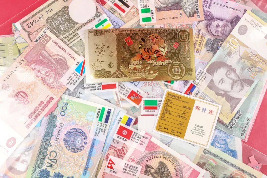 套餐二:50国100张瑞虎外币红包+赠五国硬币盲盒