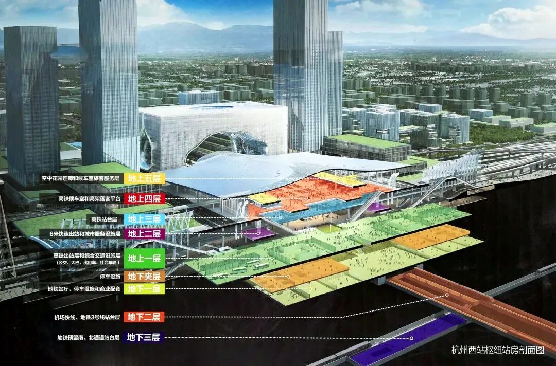 利用“高架进站”的优势,杭州西站还在高铁轨道下方设计了公园绿地和小广场;上方则加“盖子”建设休闲购物、商业办公场地,让商务办公生活更加高效便捷。