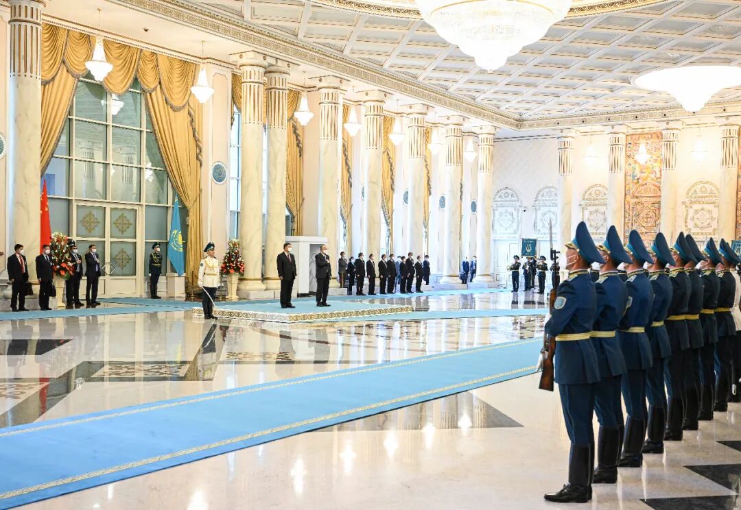 习近平乘坐的国宾车队在摩托车队护卫下抵达总统府。托卡耶夫总统在下车处热情迎接。两国元首共同步入总统府大厅。托卡耶夫为习近平举行隆重欢迎仪式。两国元首共同登上检阅台,军乐团奏中哈两国国歌。习近平在托卡耶夫陪同下检阅仪仗队。