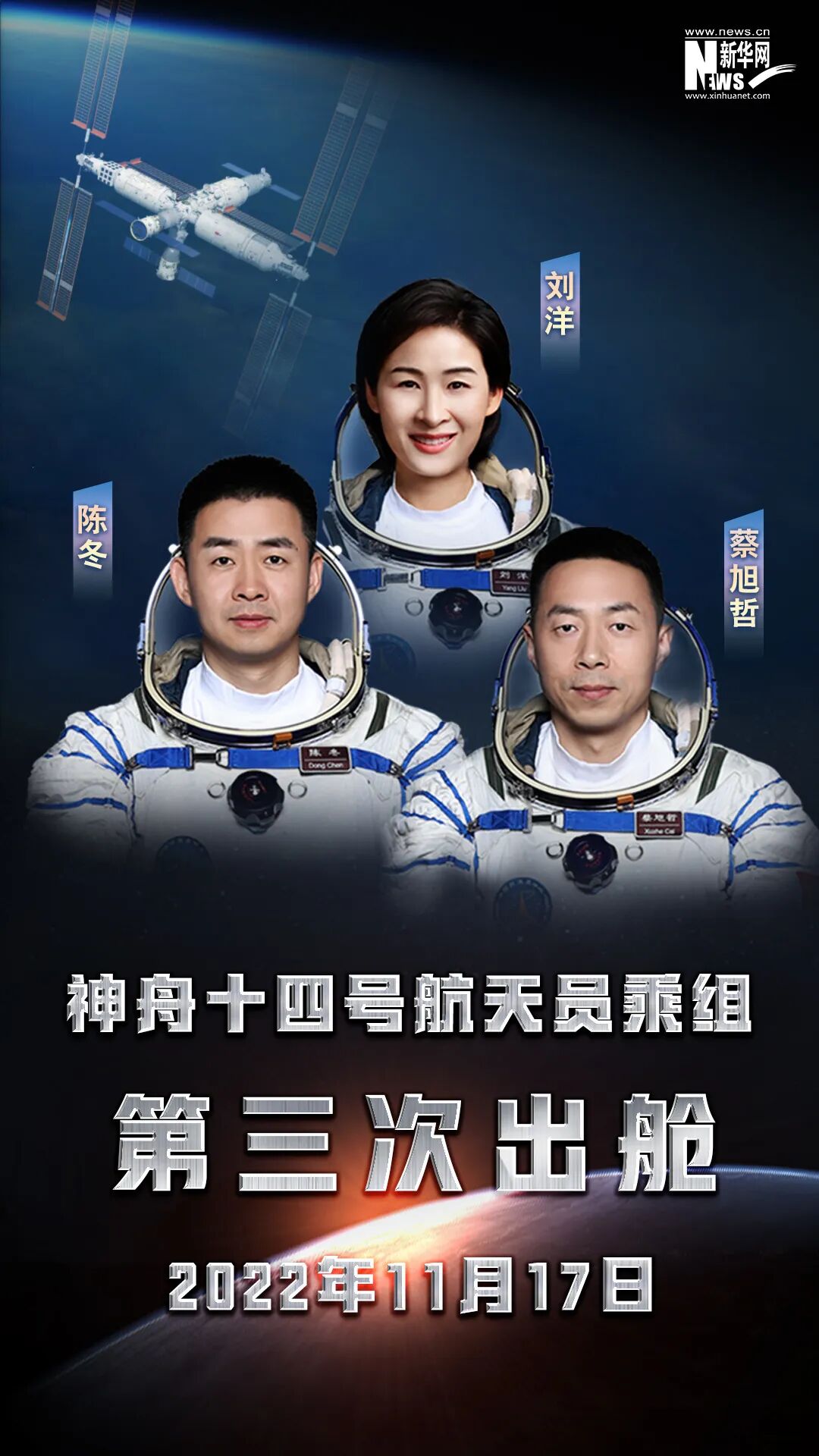 记者从中国载人航天工程办公室了解到,神舟十四号乘组17日进行第三次出舱活动。截至发稿时,航天员陈冬已出舱,航天员蔡旭哲即将出舱,航天员刘洋在核心舱内配合支持。