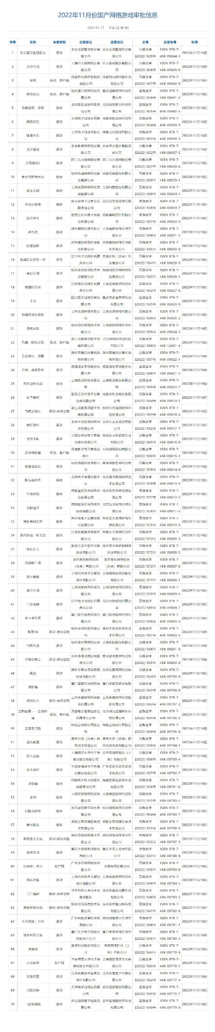 国家新闻出版署发布11月国产网络游戏审批信息,《太吾绘卷》《白荆回廊——古剑奇谭》《合金弹头:觉醒》等70款游戏获批。