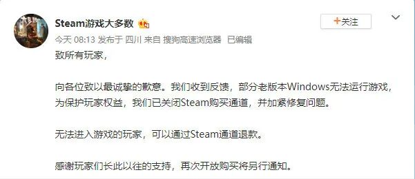 Steam《大多数》制作组发布公告,因部分老版本Windows无法运行游戏,为保护玩家权益,现已关闭Steam购买通道,并加紧修复问题。对于无法进入游戏的玩家,可通过Steam通道退款,再次开放购买将另行通知。目前游戏Steam评价褒贬不一。