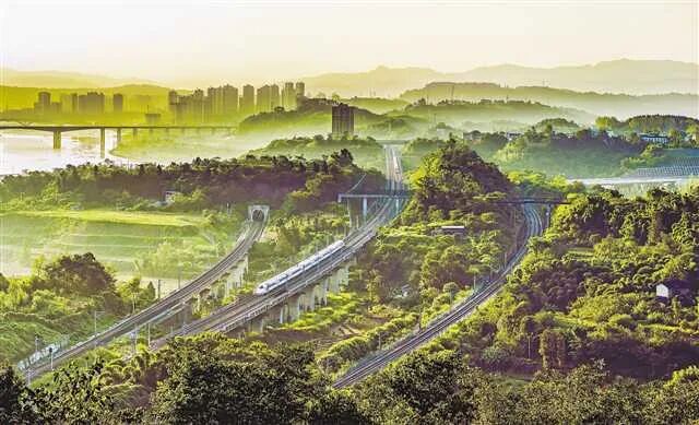 共建基础设施“一张网”,提升重庆内联外通水平,打造西部国际综合交通枢纽和国际门户枢纽,推动形成成渝间、成渝与周边城市间一小时交通圈、通勤圈。图为途经重庆市合川区铜溪镇的成渝高铁。