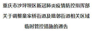10月11日,重庆市沙坪坝区新冠肺炎疫情防控指挥部发布关于调整童家桥街道及毗邻街道相关区域临时管控措施的通告。