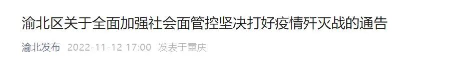 重庆市渝北区新型冠状病毒肺炎疫情防控工作指挥部发布关于全面加强社会面管控坚决打好疫情歼灭战的通告(2022年第142号)。