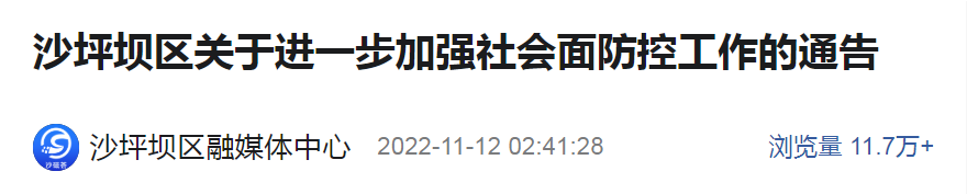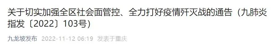 重庆市九龙坡区新型冠状病毒肺炎疫情防控工作指挥部发布关于切实加强全区社会面管控、全力打好疫情歼灭战的通告(九肺炎指发〔2022〕103号)。