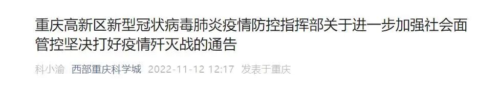 重庆高新区新型冠状病毒肺炎疫情防控指挥部发布关于进一步加强社会面管控坚决打好疫情歼灭战的通告。