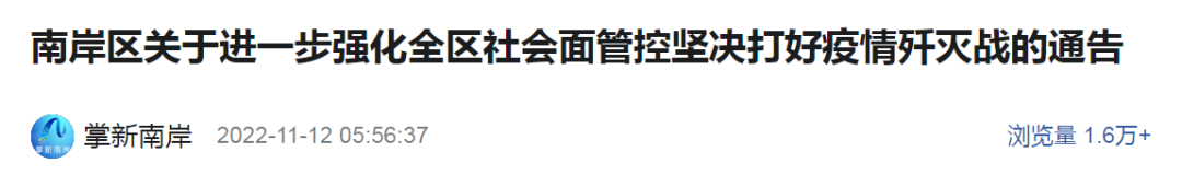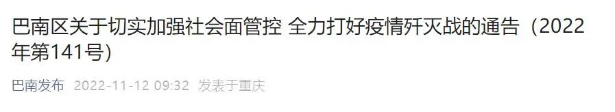 重庆市巴南区新型冠状病毒肺炎疫情防控指挥部发布关于切实加强社会面管控全力打好疫情歼灭战的通告(2022年第141号)。