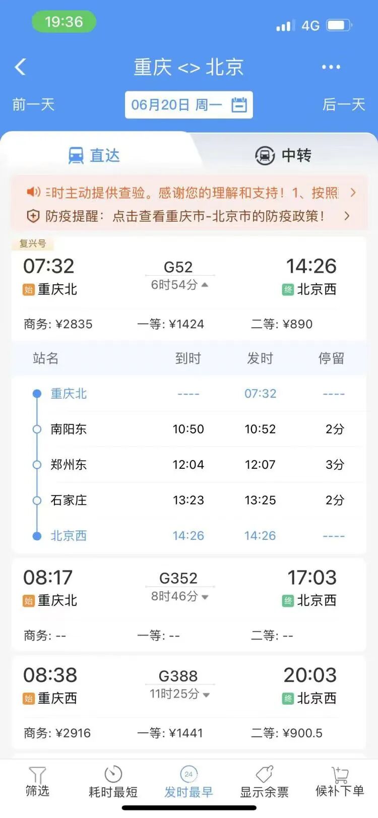 重庆北到北京西的G52次列车,全程6小时54分,二等座票价890元,一等座票价1424元,商务座2835元。