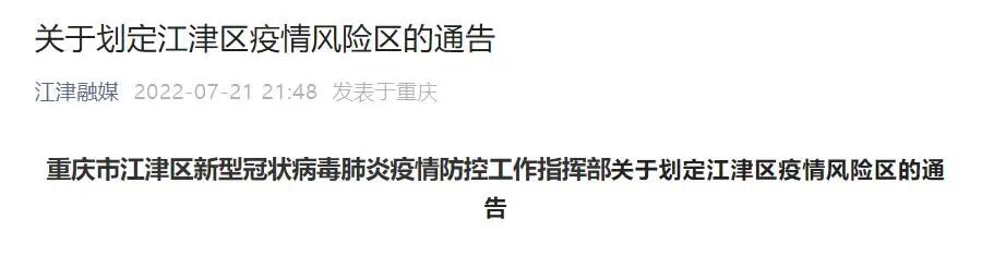 根据当前江津区疫情防控工作需要,按照国务院应对新型冠状病毒肺炎疫情联防联控机制综合组《新型冠状病毒肺炎防控方案(第九版)》相关规定,经专家组研判,自2022年7月21日起,在辖区内划定疫情高风险区、中风险区。