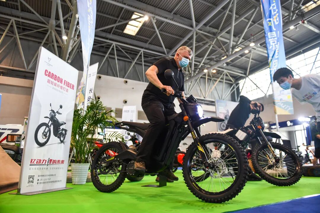 2022(第二十四届)重庆国际汽车展览会上,在N6馆的摩托车主题展区,重庆本土企业钇动力展出了由超轻碳纤维打造的电动越野摩托车。(资料图)邹乐 摄