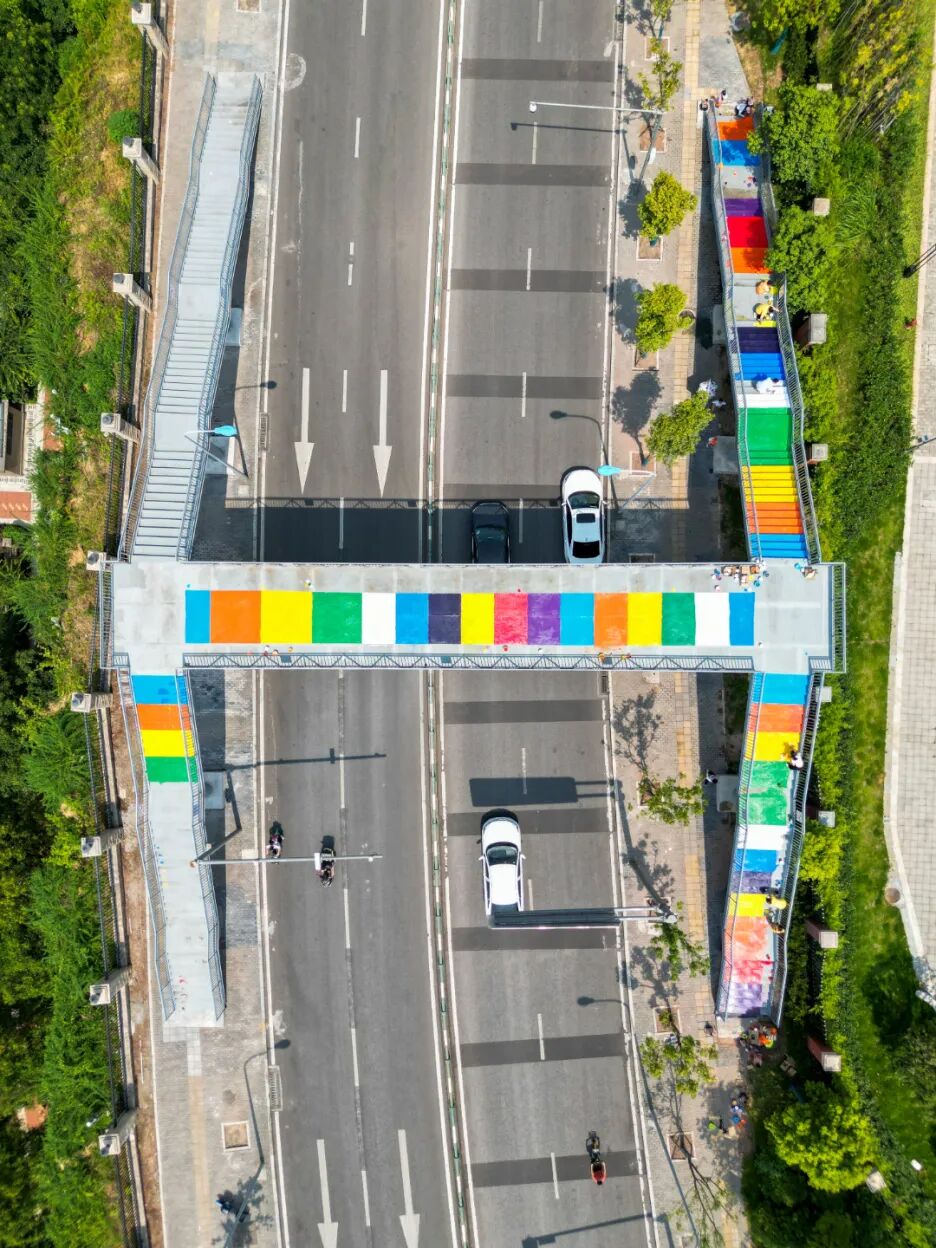 一座临时天桥被孩子们变成了“彩虹桥”!